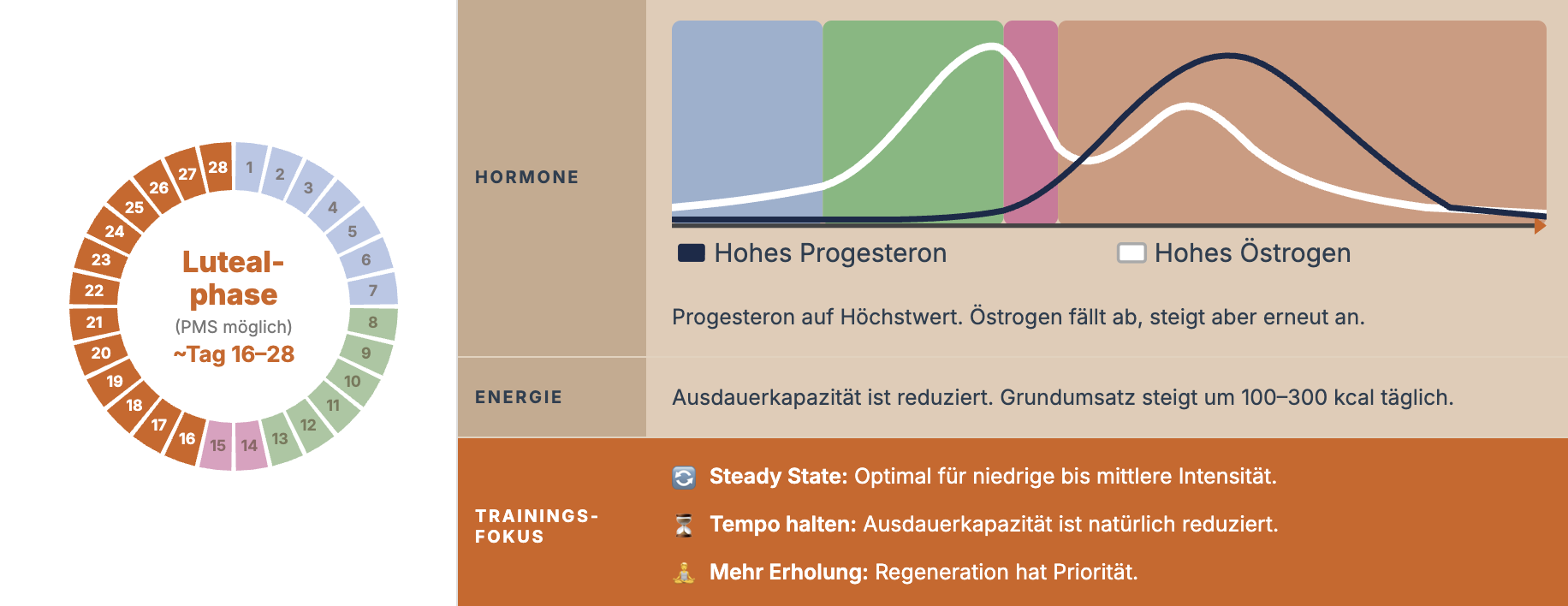Die Lutealphase ist die längste und hormonell anspruchsvollste Phase. Progesteron dominiert — und es hat weitreichende Auswirkungen: Der Cortisolspiegel steigt, die Stresstoleranz sinkt, der Körper baut die Gebärmutterschleimhaut auf und verbraucht dabei deutlich mehr Energie. Viele Frauen erleben in der letzten Woche PMS-Symptome.